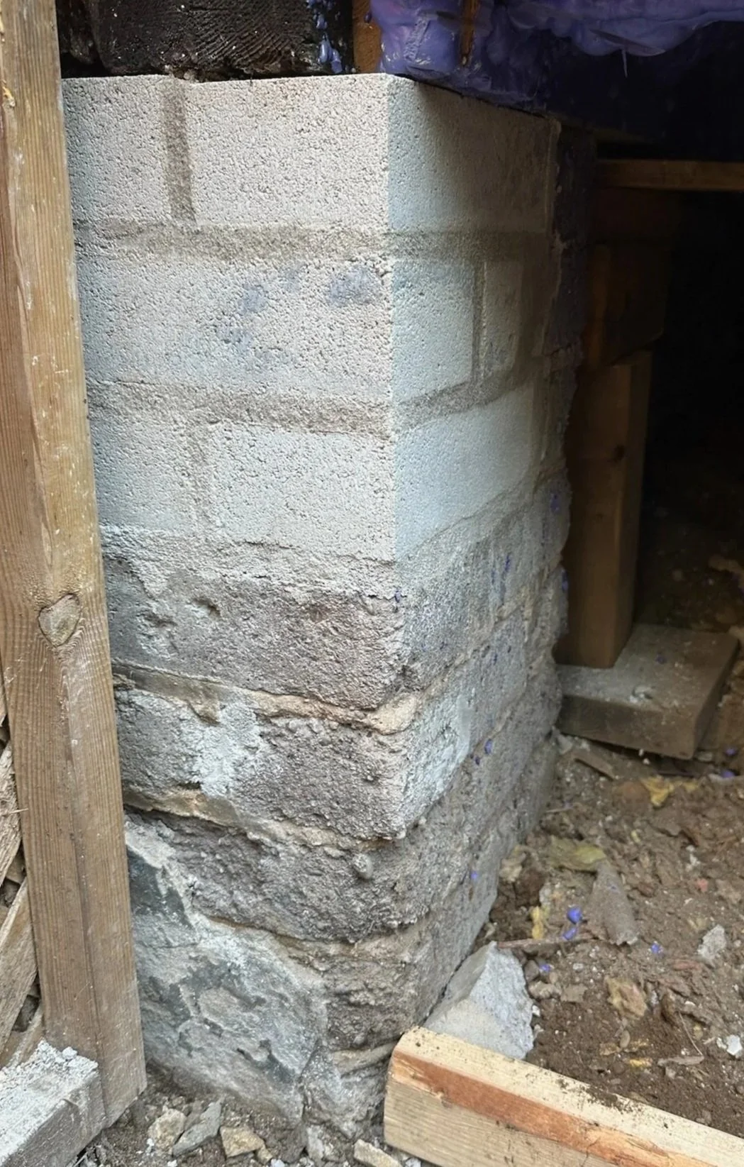 The corner foundation pillar on the rear addition of an Upper Beaches home had reached the point where bricks were decayed at the top and some were missing entirely. For a corner pillar — which takes load from two directions at once — that's not a cosmetic issue. It's a structural one.