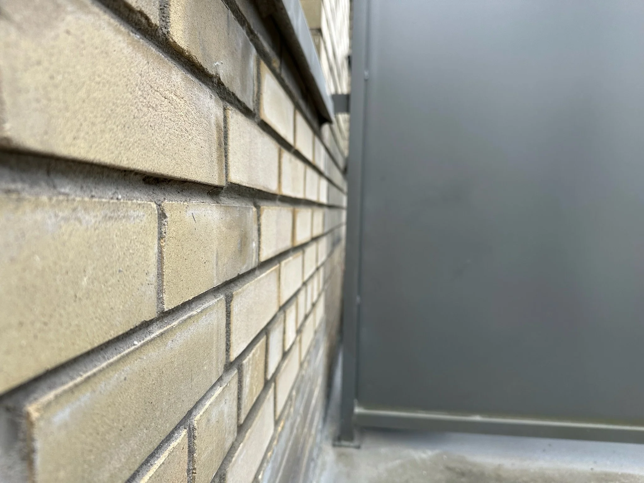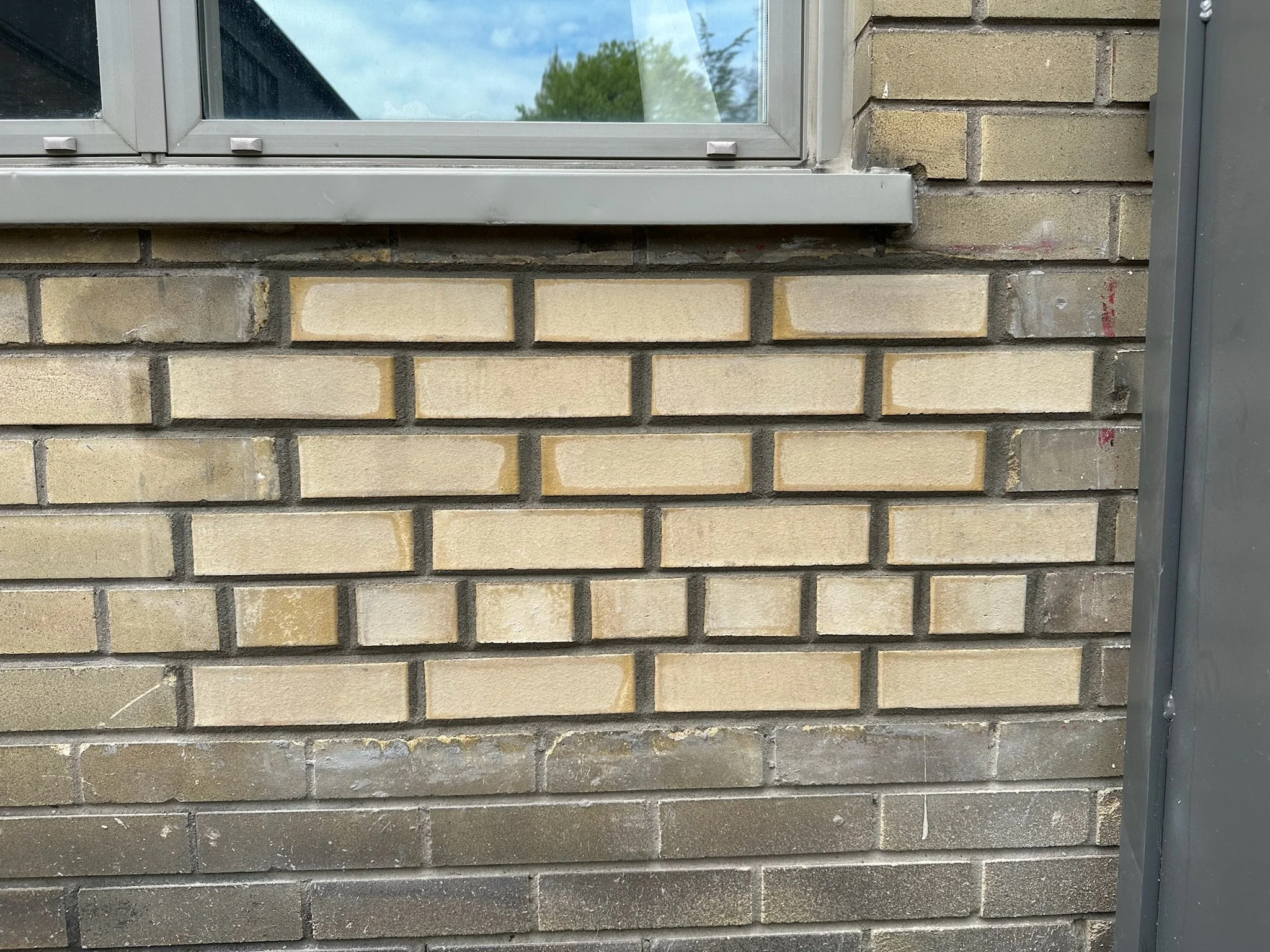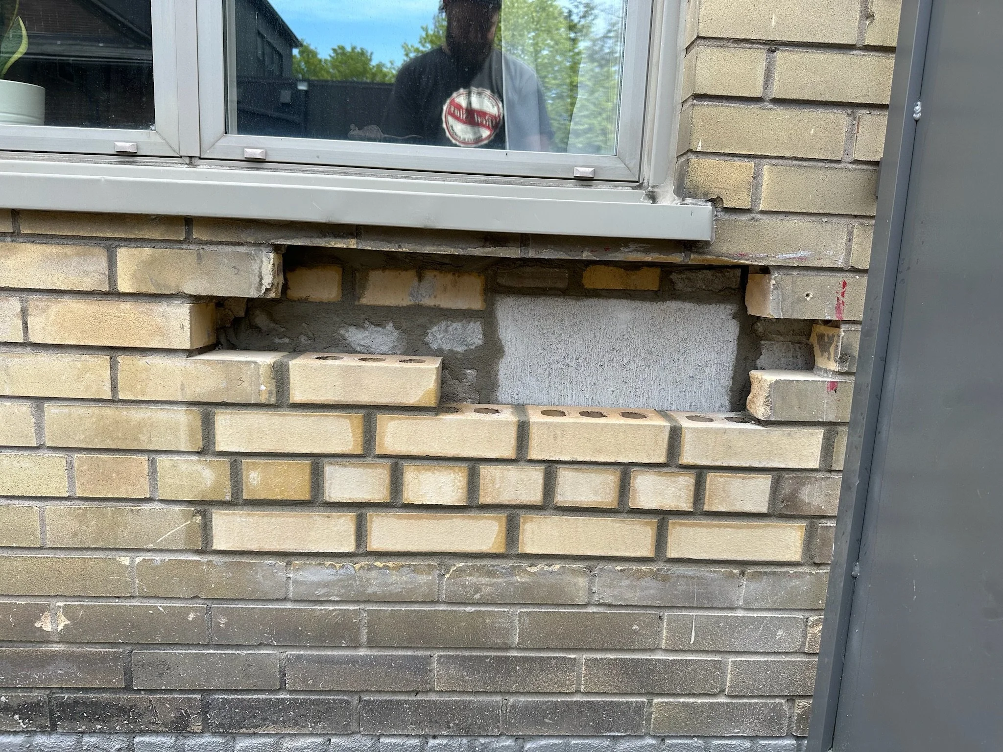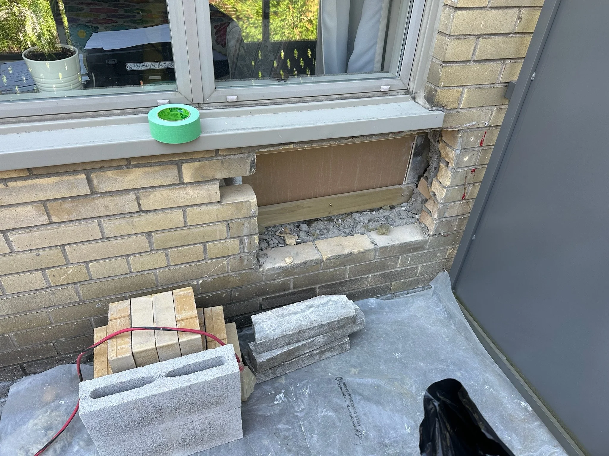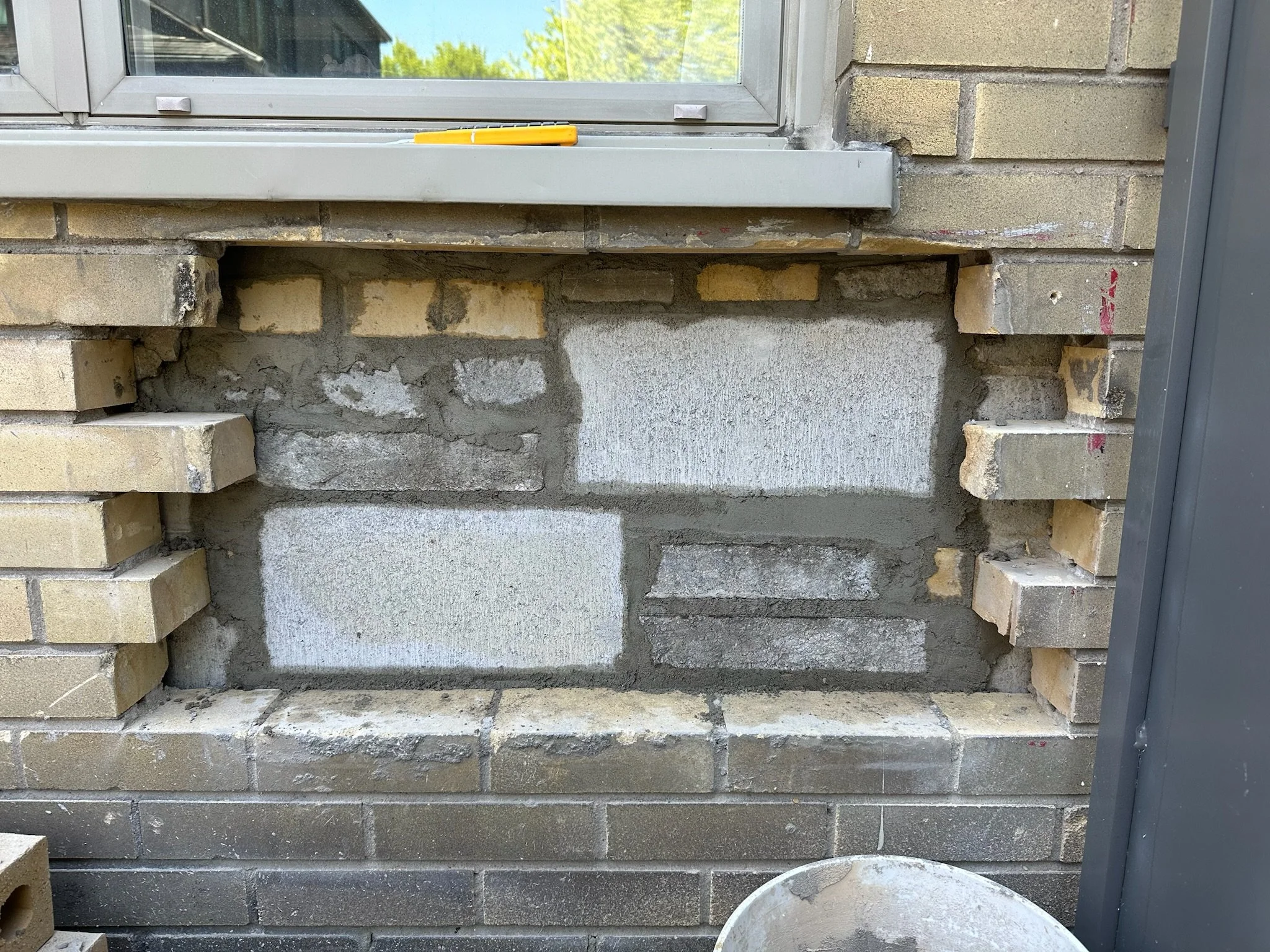 The approach: We rebuilt the wall from the inside out. A concrete-block backup wall was laid to carry load, then tied into the existing brickwork. On the exterior face, new bricks (sourced to match the existing bricks) were set in a running bond matched to the surrounding masonry so the infill reads as part of the original wall. Mortar was tooled to match the adjacent joints in depth and profile.