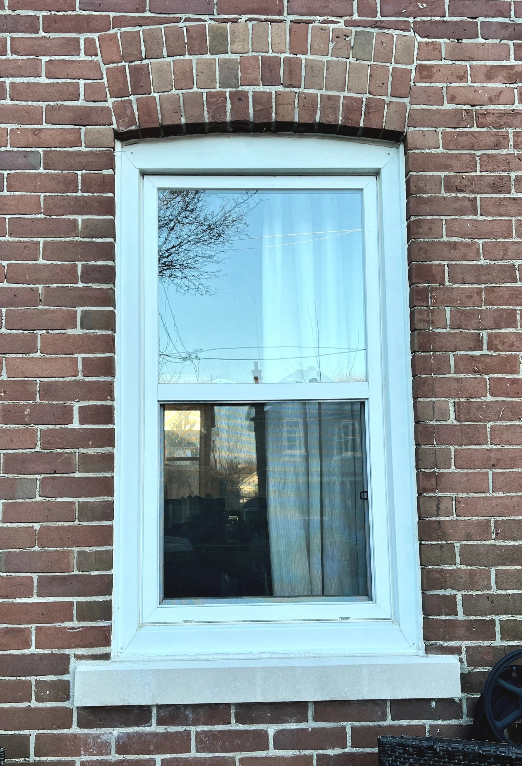 While the front door was being replaced, our team came in to work with the door installers to remove the old rotting wood sill and install the new Indiana Limestone sill. The existing brick window sill was removed and replaced with a new Indiana Limestone sill.